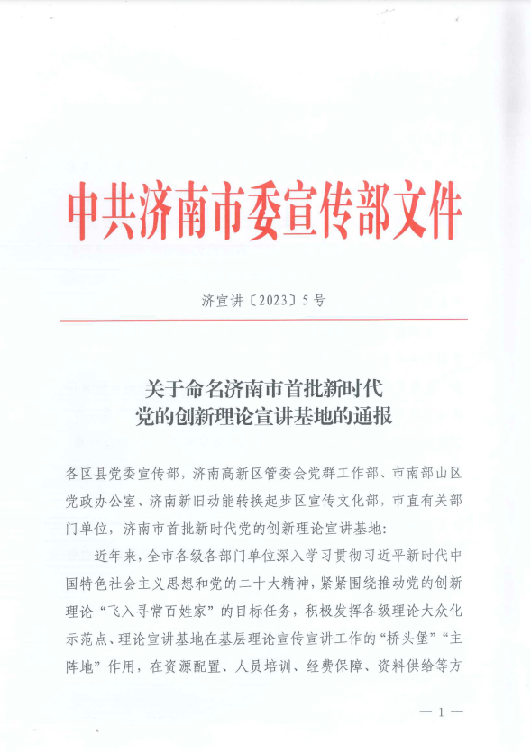 近日,中共濟南市委宣傳部印發通知,公布“濟南市首批新時代黨的創新理論宣講基地”名單,濟南城市投資集團位列其中。