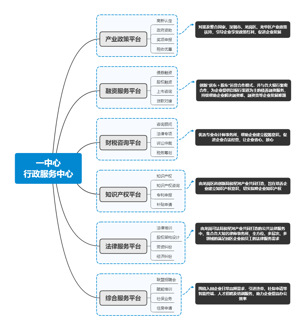 高質(zhì)量發(fā)展需要精細(xì)化運營 2022年以來,政策不斷加持下,建設(shè)認(rèn)定一批“專精特新”產(chǎn)業(yè)園,加快“專精特新”企業(yè)集聚發(fā)展;支持“專精特新”產(chǎn)業(yè)園提升服務(wù)功能,鼓勵產(chǎn)業(yè)園區(qū)引進重點項目和企業(yè),培育和壯大重點產(chǎn)業(yè)集群已經(jīng)成為國內(nèi)部分城市推動“專精特新”企業(yè)集群集聚的一種選擇。如重慶兩江新區(qū)認(rèn)定金泰產(chǎn)業(yè)園、大地企業(yè)公園等四個園區(qū)為為“專精特新”產(chǎn)業(yè)園等。 在此基礎(chǔ)上,一方面,產(chǎn)城運營商聚焦專精特新發(fā)展的關(guān)鍵領(lǐng)域和環(huán)節(jié),在園區(qū)運營服務(wù)層面構(gòu)建專門面向?qū)>匦缕髽I(yè)的服務(wù)框架。如星河產(chǎn)業(yè)集團提出了“1+2+3”專精特新的服務(wù)模式。“1”是區(qū)域政府,包括國家的有關(guān)部門,在政策方向上進行方向指導(dǎo);“2”是培育單位,星河產(chǎn)業(yè)集團聯(lián)合領(lǐng)軍企業(yè)研究院共同成立了專精特新的服務(wù)中心,通過研究院和星河產(chǎn)業(yè)集團做培育單位進行企業(yè)培育和招商運營。“3”是小巨人企業(yè),通過龍頭企業(yè)、小巨人企業(yè)的參與,構(gòu)建產(chǎn)業(yè)協(xié)同、創(chuàng)新帶動的共建模式。與此同時,星河還搭建了“1+6”重點工程,加速專精特新企業(yè)集聚、成長、創(chuàng)新轉(zhuǎn)型。 另一方面,在政策指引下,不僅是企業(yè)在走向?qū)>匦拢瑘@區(qū)運營商也在打造“專精特新”運營模式。其一,賽道專業(yè)化,園區(qū)運營商通過打造主題園區(qū),推動產(chǎn)業(yè)鏈上下游的中小企業(yè)規(guī)模化集聚,讓企業(yè)在產(chǎn)業(yè)生態(tài)中持續(xù)發(fā)展,建立穩(wěn)定可觀的供應(yīng)鏈需求運營商配合集中投放資源,協(xié)同政府制定政策,讓企業(yè)獲得成本可控的長期供應(yīng)鏈保障。其二,運營精細(xì)化,不斷加強園區(qū)服務(wù)的數(shù)字化、智能化管理,完善園區(qū)配套建設(shè)和服務(wù)體系,在延伸產(chǎn)業(yè)鏈條、形成產(chǎn)業(yè)集群、構(gòu)建產(chǎn)業(yè)生態(tài)的同時提升運營商資產(chǎn)效率。其三,資源特色化,園區(qū)運營商基于園區(qū)產(chǎn)業(yè)基礎(chǔ)、自身資源稟賦、區(qū)域市場擴張能力聚焦細(xì)分領(lǐng)域打造自身核心業(yè)務(wù)優(yōu)勢。如微醫(yī)集團結(jié)合“互聯(lián)網(wǎng)+醫(yī)療健康”業(yè)態(tài),打造互聯(lián)網(wǎng)健康醫(yī)療小鎮(zhèn),覆蓋“全科+專科、線上+線下”的醫(yī)療健康服務(wù)體系。其四,服務(wù)創(chuàng)新化,運營商搭載數(shù)字化等新興技術(shù)賦能園區(qū)運營管理,通過打造智慧園區(qū)平臺帶動管理模式創(chuàng)新、通過REITs等投融管退模式打通輕重資產(chǎn)循環(huán),創(chuàng)新商業(yè)模式等。深圳·星河雙子塔:依托深圳·星河WORLD產(chǎn)融大城,搭載全方位服務(wù)及配套 3月底,“融合共生 向新而行”中國最高等高雙子塔全球發(fā)布會在深圳·星河WORLD舉行。深圳·星河雙子塔作為深圳·星河WORLD產(chǎn)融大城升級力作,于深圳中軸之上,乘160萬m2超級灣區(qū)都會之勢,打造369米中國最高等高雙子塔。深圳·星河WORLD是集產(chǎn)業(yè)、商務(wù)、居住、教育、購物、休閑等多種業(yè)態(tài)配套的產(chǎn)融新城,園區(qū)占據(jù)福田CBD、深圳北站商務(wù)區(qū)和坂雪崗科技城三角鼎立優(yōu)勢區(qū)位,定位“園區(qū)+金融”雙閉環(huán)總部基地。目前已聚集超1200家企業(yè),其中世界500強26家、上市企業(yè)46家,134家國高企業(yè),形成新一代信息技術(shù)、高端裝備制造、文化創(chuàng)意、生命健康、科技金融五大產(chǎn)業(yè)集群,預(yù)計雙子塔建成后整個園區(qū)將提供超7.5萬就業(yè)崗位。 產(chǎn)業(yè)、企業(yè)、人才的發(fā)展離不開良好的營商環(huán)境,為提升產(chǎn)業(yè)競爭力,助推企業(yè)全生命周期成長,星河產(chǎn)業(yè)以聯(lián)盟共享理念為核心,以資源運作為抓手,以平臺生態(tài)圈建設(shè)為宗旨,與入駐企業(yè)、合作伙伴、地方政府等共建全方位產(chǎn)業(yè)運營服務(wù)體系,實現(xiàn)多方共生、共贏。依托星河強大的綜合業(yè)務(wù)板塊協(xié)同,星河超級企業(yè)服務(wù)中心通過打造“一中心六平臺”的服務(wù)體系,以產(chǎn)業(yè)服務(wù)為核心、物業(yè)服務(wù)為基礎(chǔ)、商務(wù)及配套服務(wù)為支點,致力于締造全方位多層次的高端智慧服務(wù)。該服務(wù)體系涵蓋了279項服務(wù)、逾300人服務(wù)團隊、“1234”響應(yīng)機制、24小時服務(wù)終端等內(nèi)容,已累計服務(wù)企業(yè)逾1300家次,協(xié)助逾700家企業(yè)開展申報工作、服務(wù)企業(yè)員工超10000次。