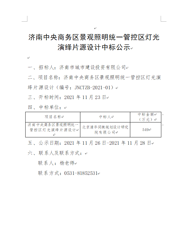 濟南中央商務區景觀照明統一管控區燈光演繹片源設計中標公示