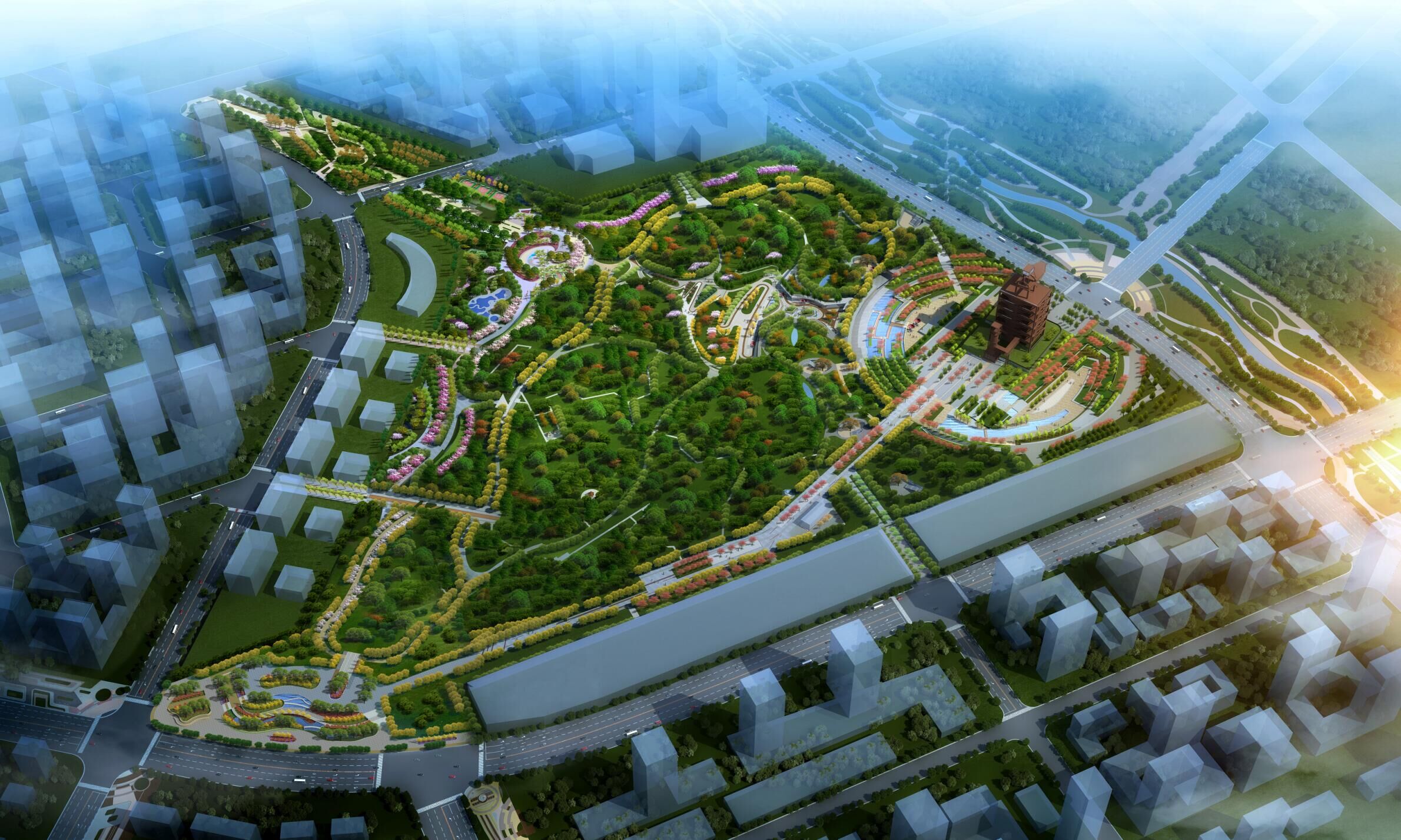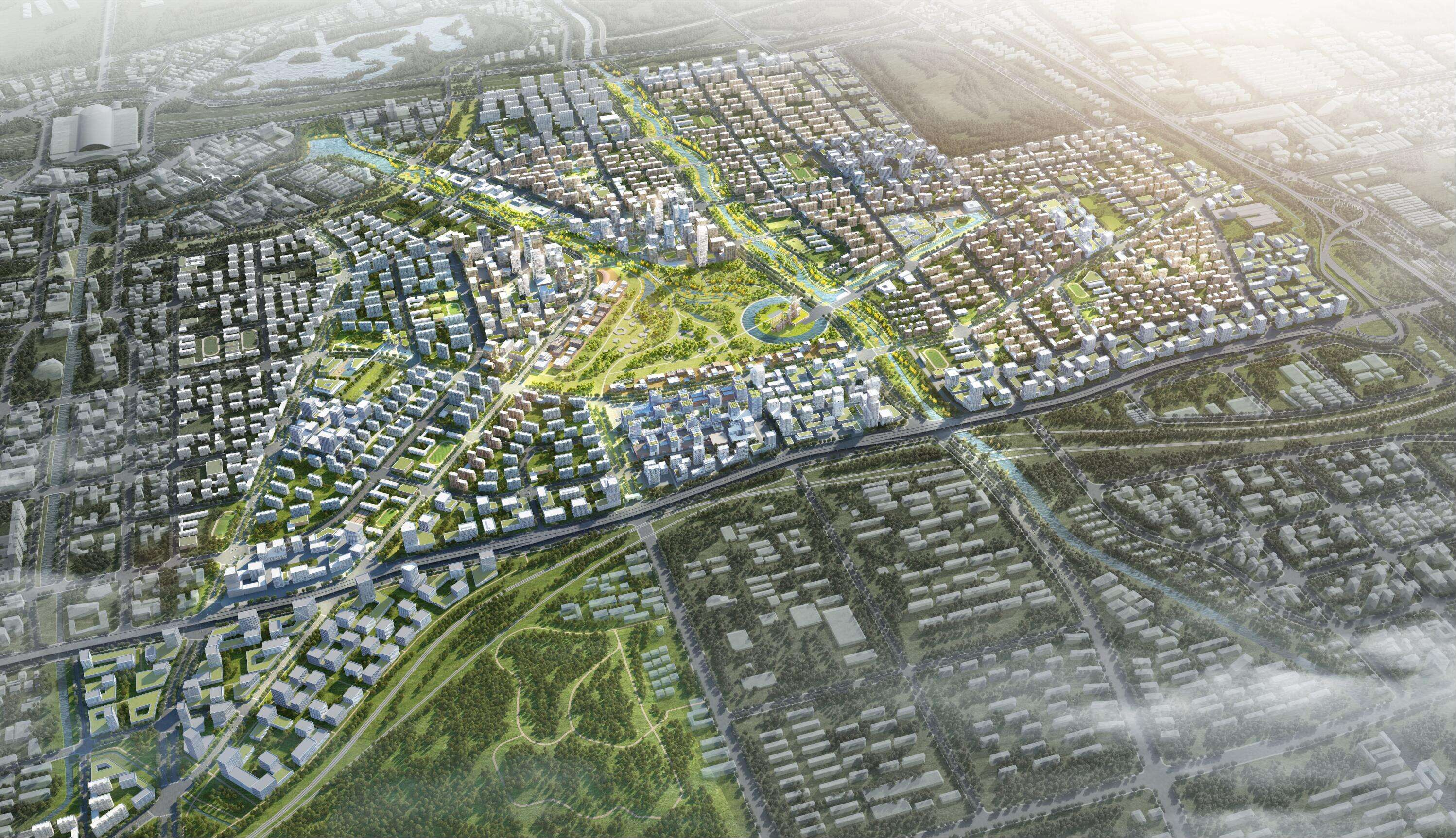 片區(qū)堅(jiān)持生態(tài)優(yōu)先、綠色發(fā)展的理念,先行啟動(dòng)中央森林公園、森林公園地下商業(yè)、韓倉(cāng)河生態(tài)景觀帶綜合整治等項(xiàng)目的建設(shè)。其中森林公園占地面積約 680 畝,綠地率高達(dá) 86%,為濟(jì)南“東強(qiáng)”區(qū)域的綠肺;韓倉(cāng)河生態(tài)景觀綜合整治項(xiàng)目融合生態(tài)防護(hù)、休閑游賞功能于一體,形成東部新城獨(dú)特的生態(tài)景觀。片區(qū)還將對(duì)濟(jì)鋼大門(mén)、3200 高爐等進(jìn)行保留改造,形成新舊建筑形態(tài)的碰撞與融合,引領(lǐng)城市的更新和多元化發(fā)展。
